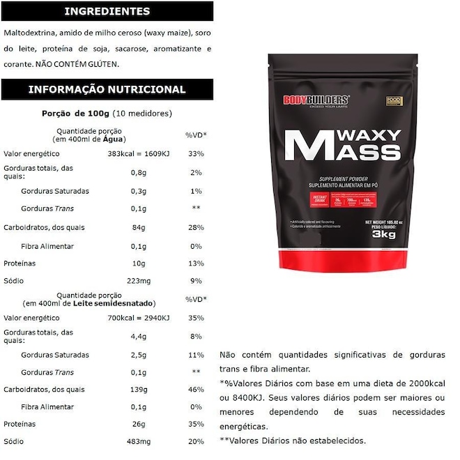 Composição do Kit: 1x HIPERCALÓRICO Waxy Mass: Refil com 3kg 1x BCAA 4.5: Pote com 100g 1x CREATINA: Pote com 100g 1x COQUETELEIRA: 600ml HIPERCALÓRICO WAXY MASS foi desenvolvido com os melhores carboidratos de rápida absorção em conjunto com as proteínas do soro do leite e da soja, fornecendo a cada dose se consumido com leite semidesnatado 727kcal e 26g de proteínas. Indicado para pessoas que têm o metabolismo muito acelerado e querem ganhar peso desenvolvendo massa magra. BCAA 4.5 é um suplemento alimentar composto pelos 3 aminoácidos essenciais de cadeia ramificada, L-Leucina, L-Isoleucina e L-Valina. Esses componentes atuam diretamente na musculatura para proporcionar a aceleração da recuperação das fibras musculares pós- treino, auxiliam na diminuição das dores musculares e fadiga gerando assim maior energia e força para execução dos exercícios. CREATINA é usada pelo tecido muscular para a produção de fosfocreatina, fator importante na formação de adenosina trifosfato (ATP), que funciona como um repositor de energia. Proveniente de um composto produzido naturalmente pelo organismo, a creatina é formada a partir da associação de 3 aminoácidos de alto valor biológico: arginina, glicina e metionina. COQUETELEIRA fabricada em material plástico resistente. A cor varia de acordo com disponibilidade em estoque. SUGESTÃO DE CONSUMO: a) Hipercalórico Waxy Mass: Adicionar 160g (8 colheres de sopa rasas) em 250ml (1 + 1/4 copo) de água ou leite semidesnatado. Consumir imediatamente após o preparo. Ingerir 2 porções diárias ou conforme orientação de médico e/ou nutricionista. b) BCAA: Sugere-se 1 porção de 5g (1 colheres de chá) diluída em 200ml (1 copo) de água. c) Creatina: Dissolver 3g (1 colher de café) em 100ml (1/2 copo) de água. Recomenda-se a ingestão de 1 porção ao dia. IMPORTANTE: a) Validade dos produtos: de 18 a 24 meses b) Vendemos somente produtos originais e devidamente lacrados