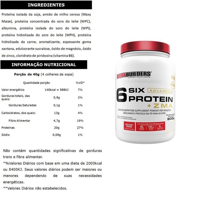 Composição do kit: 1x WHEY PROTEIN 6 Protein Advanced + ZMA - pote de 900g 1x HIPERCALÓRICO Waxy Mass - pote de 3kg 1x ZMA - pote de 120 Tabletes 1x BCAA 4,5 - pote de 100g no sabor Tangerina 1x CREATINA - pote de 100g 1x COQUETELEIRA - 600ml WHEY PROTEIN 6 Six Protein Advanced + ZMA é um blend proteico fabricado com 6 tipos de proteínas de alto valor biológico proporcionando assim os aminoácidos necessários para uma dieta completa e equilibrada. Sua nova fórmula contem ZMA, suplemento vitamínico e mineral à base de magnésio, zinco e vitamina B6. Essa combinação revolucionária contém concentrações específicas dessas substâncias, as quais ajudam a aumentar os hormônios anabólicos, recuperação, cicatrização, manutenção de tecidos, crescimento muscular e força. HIPERCALÓRICO Waxy Mass é indicado para pessoas que têm o metabolismo muito acelerado e querem ganhar peso desenvolvendo massa magra. O hipercalórico foi desenvolvido com os melhores carboidratos de rápida absorção em conjunto com as proteínas do soro do leite e da soja, fornecendo a cada dose se consumido com leite semidesnatado 727kcal e 26g de proteínas. ZMA DROL é um suplemento vitamínico e mineral à base de magnésio, zinco e vitamina B6. Contém formas exclusivas e fórmula revolucionária que combina concentrações específicas dessas substâncias, as quais ajudam a aumentar os hormônios anabólicos, recuperação, cicatrização, manutenção de tecidos, crescimento muscular e força. Por causa da eficácia no aumento dos níveis de testosterona, esse suplemento é utilizado por milhares de atletas em todo mundo como uma alternativa segura e natural de pró-hormônios. BCAA 4.5 promove uma maior recuperação muscular e aumento da resistência no pré e pós-treino, fornecendo um maior efeito anti-catabólico sendo um importante suplemento alimentar para ganhos de massa e recuperação muscular. CREATINA é usada pelo tecido muscular para a produção de fosfocreatina, fator importante na formação de adenosina trifosfato (ATP), que funciona como um repositor de energia. Recomenda-se a ingestão com água, ou conforme orientação de um médico ou nutricionista. COQUETELEIRA fabricada em plástico resistente e a cor da coqueteleira varia de acordo com estoque. SUGESTÃO DE CONSUMO: a) Hipercalórico: Adicionar 160g (8 colheres de sopa cheia) em 250ml (1 ¹/4 copo) de leite semidesnatado. Ingerir 2 porções diárias ou conforme orientação de médico e/ou nutricionista. b) Whey Protein: Adicionar 40g (4 colheres de sopa) em 300ml (1 1/2 copo) de água. Bater no liquidificador ou coqueteleira por 20 segundos. Consumir imediatamente após o preparo. c) ZMA: Ingerir 2 tabletes ao dia (1x ao dia). d) BCAA: Sugere-se 1 porção de 5g (1 colher de chá) diluída em 200ml (1 copo) de água. Consumir após o treino ou conforme orientação profissional. e) Creatina: Dissolver 6g (2 colheres de café) em 100ml (1/2 copo) de água, uma porção ao dia. IMPORTANTE: a) Validade dos produtos: de 18 a 24 meses b) Vendemos somente produtos originais e devidamente lacradosref: M0ECBE