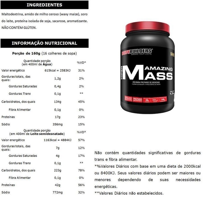 Composição do kit: 1x HIPERCALÓRICO Amazing Mass - Pote com 1,5kg 1x HIPERCALÓRICO Waxy Mass - Pote com 3kg HIPERCALÓRICO Waxy Mass é indicado para pessoas que têm o metabolismo muito acelerado e querem ganhar peso desenvolvendo massa magra. O hipercalórico foi desenvolvido com os melhores carboidratos de rápida absorção em conjunto com as proteínas do soro do leite e da soja, fornecendo a cada dose se consumido com leite semidesnatado 727kcal e 26g de proteínas. HIPERCALÓRICO Amazing Mass é indicado para pessoas que têm o metabolismo muito acelerado e querem ganhar peso desenvolvendo massa magra. O hipercalórico HIPER AMAZING MASS BODYBUILDERS® foi desenvolvido com os melhores carboidratos de rápida absorção em conjunto com as proteínas do soro do leite e da soja, fornecendo a cada dose se consumido com leite semidesnatado 727kcal e 26g de proteínas. Sugestão de consumo: a) HIPERCALÓRICO Waxy Mass Adicionar 160g (8 colheres de sopa cheia) em 250ml (1 ¹/4 copo) de leite semidesnatado. Ingerir 2 porções diárias ou conforme orientação de médico e/ou nutricionista. b) HIPERCALÓRICO Amazing Mass: Adicionar 160g em 400ml de água. Consumir imediatamente após o preparo. Importante: a) Validade dos produtos: de 18 a 24 meses b) Vendemos somente produtos originais e devidamente lacradosref: M0BT9G
