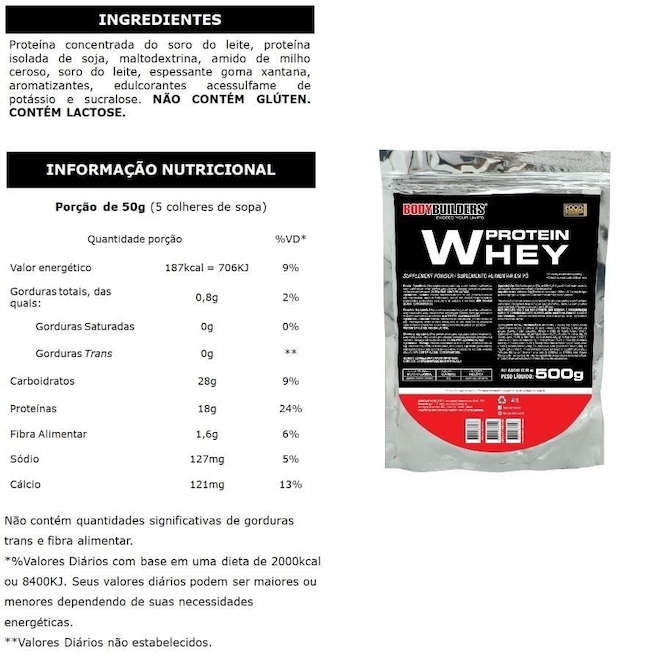 Composição do Kit: 1x HIPERCALÓRICO WAXY MASS: Pote com 3kg 1x WHEY PROTEIN: Refil com 500g 1x BCAA 4,5g: Pote com 100g HIPERCALÓRICO WAXY MASS é indicado para pessoas que têm o metabolismo muito acelerado e querem ganhar peso desenvolvendo massa magra. HIPERCALÓRICO WAXY MASS foi desenvolvido com os melhores carboidratos de rápida absorção em conjunto com as proteínas do soro do leite e da soja, fornecendo a cada dose se consumido com leite semidesnatado 727kcal e 26g de proteínas. WHEY PROTEIN é um alimento em pó balanceado, à base de Proteína Concentrada do Soro do Leite (WPC), rica em aminoácidos essenciais de rápida absorção. WHEY PROTEIN, sendo uma proteína de alto valor biológico (HBV) complementa a dieta diária e promove a manutenção da massa magra e a saúde geral do organismo. BCAA 4.5 BODYBUILDERS promove uma maior recuperação muscular e aumento da resistência no pré e pós-treino, fornecendo um maior efeito anti-catabólico sendo um importante suplemento alimentar para ganhos de massa e recuperação muscular. SUGESTÃO DE CONSUMO: a) HIPERCALÓRICO Adicionar 160g (8 colheres de sopa cheia) em 250ml (1 ¹/4 copo) de leite semidesnatado. Ingerir 2 porções diárias ou conforme orientação de médico e/ou nutricionista. b) WHEY PROTEIN: Consumir 1 porção de 50g (5 colheres de sopa) diluído em 300ml (1 ½ copo) de água gelada, logo após a atividade física. Consumir imediatamente após o preparo. c) BCAA: Adicionar 6g (2 colheres de café) em 200ml (1 copo) de água. Consumir imediatamente após o preparo. IMPORTANTE: a) Validade dos produtos: de 18 a 24 meses b) Vendemos somente produtos originais e devidamente lacradosref: M0BTAI