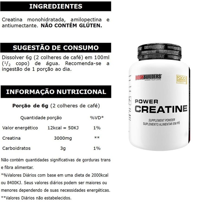 CREATINA é proveniente de um composto produzido naturalmente pelo organismo, a creatina é formada a partir da associação de 3 aminoácidos de alto valor biológico: arginina, glicina e metionina. É usada pelo tecido muscular para a produção de fosfocreatina, fator importante na formação de adenosina trifosfato (ATP), que funciona como um repositor de energia. Recomenda-se a ingestão com água, ou conforme orientação de um médico ou nutricionista. Pode-se adicionar algum carboidrato, como maltodextrina ou sacarose na água, para facilitar seu transporte para dentro da célula muscular.