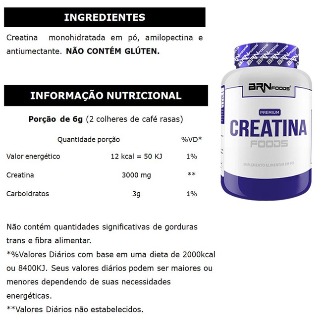 CREATINA é proveniente de um composto produzido naturalmente pelo organismo, a creatina é formada a partir da associação de 3 aminoácidos de alto valor biológico: arginina, glicina e metionina. A CREATINE FOODS 100% é usada pelo tecido muscular para a produção de fosfocreatina, fator importante na formação de adenosina trifosfato (ATP), que funciona como um repositor de energia.