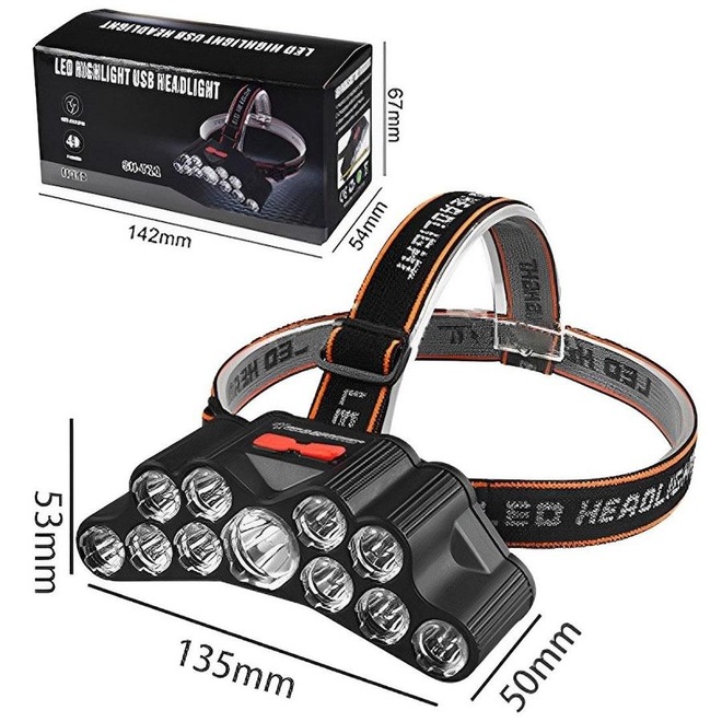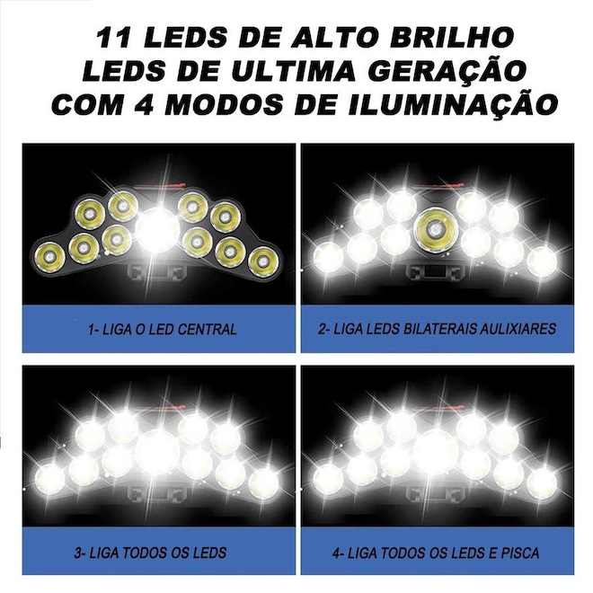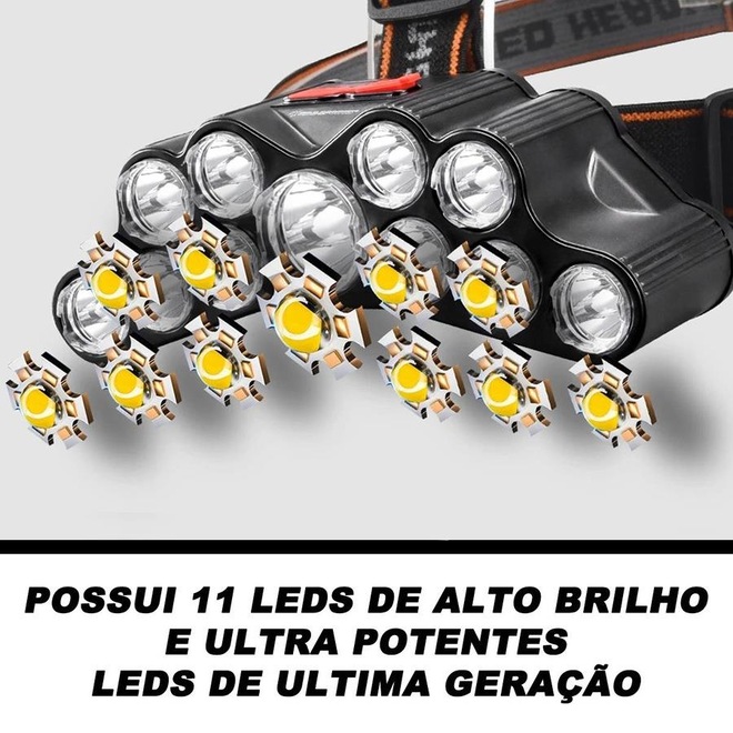 Lanterna De Cabeça Gold Sports Holofote 11 Leds de ultima geração sendo um grande central de alto alcance Recarregável 4 modelos de iluminação Bateria de Lítio A Prova de Água
