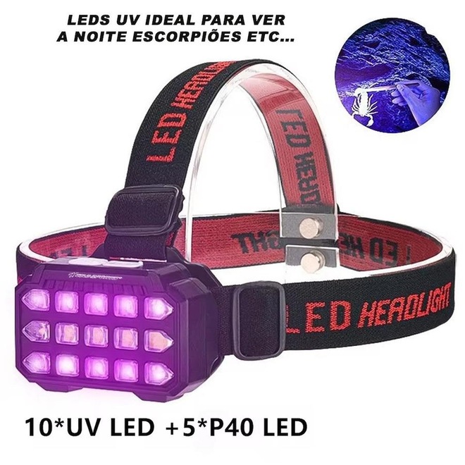 Lanterna Cabeça Gold Sports UV e Leds Recarregáveis 4 Model Bateria de Lítio A Prova Água de ultima geração sendo um grande central de alto alcance Recarregável 4 modelos de iluminação Bateria de Lítio A Prova de Água