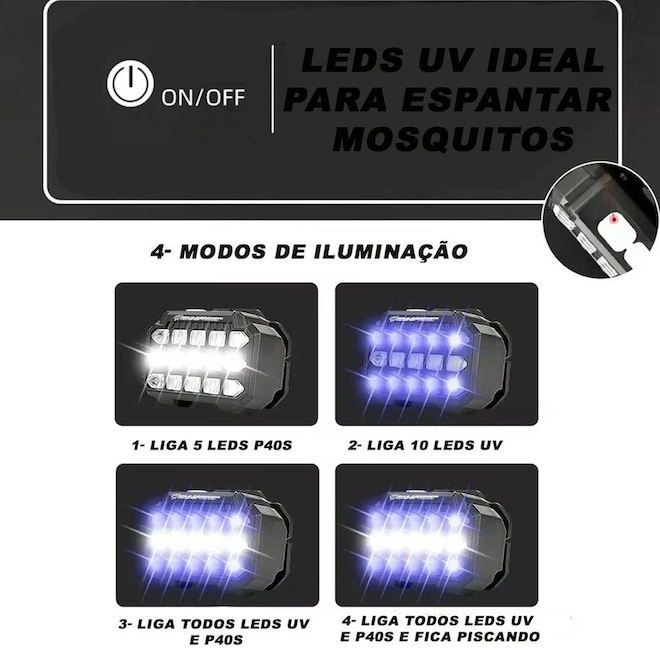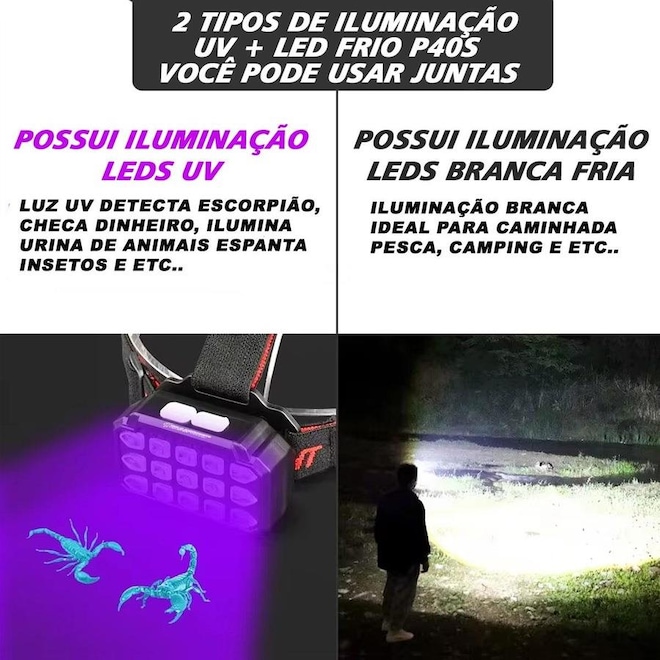 ? Grânulos COB e LED e Leds UV:A lanterna usa contas COB e LED para fornecer iluminação brilhante e eficiente.Os leds Uv são muito util para a espantar mosquitos, exergar animais pesonhentos, e trilas de urinas de animais.