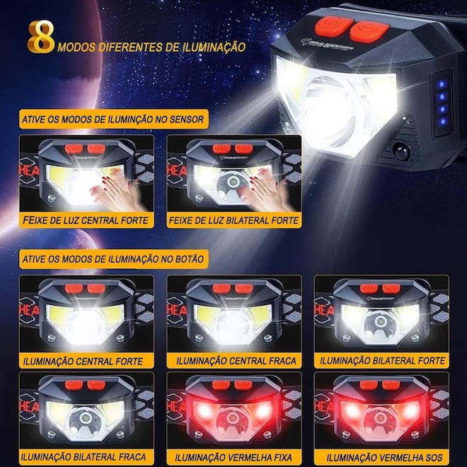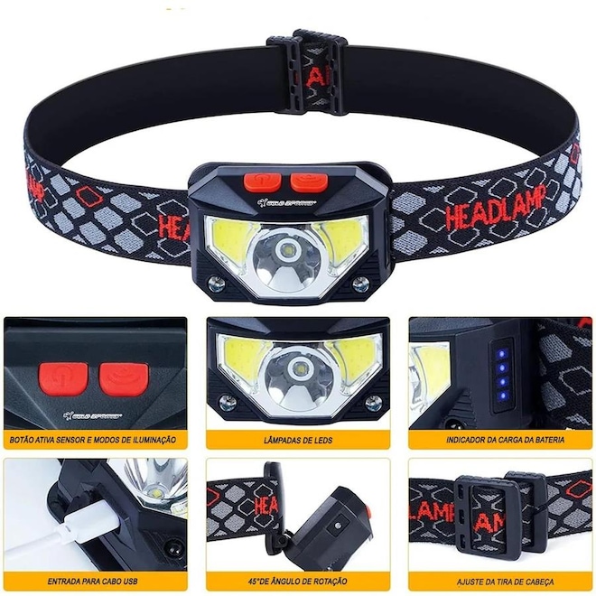Lanterna De Cabeça Gold Sports Holofote Pro Recarregável 8 modelos de iluminação Bateria de Lítio A Prova de Água? Bateria recarregável: Não há necessidade de substituir constantemente as baterias. Basta recarregar a lanterna usando um cabo USB.? 8 iluminação modos: Escolha entre 8 modos de iluminação diferentes para atender às suas necessidades, incluindo luz branca e vermelha.