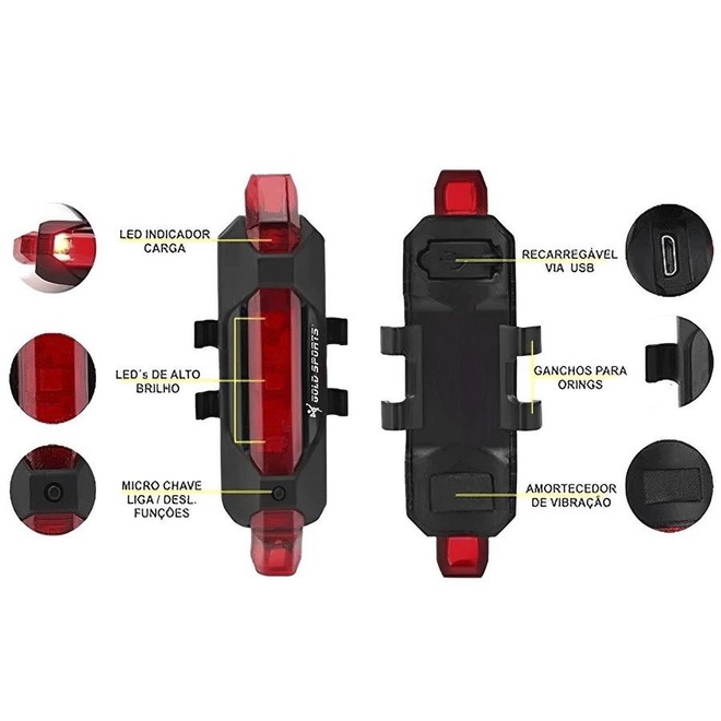 Lanterna de Bike Gold Sports Traseira Led Clear Vision 4 Modos de Funções Cabo Usb Recarregável