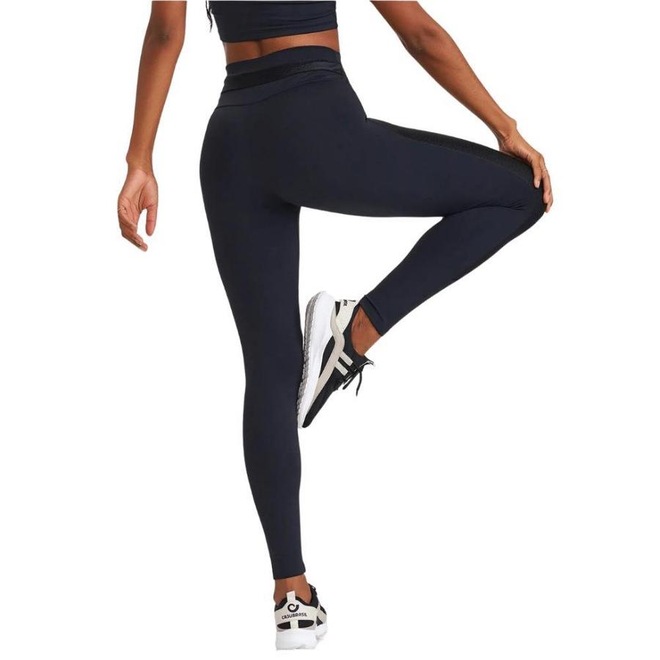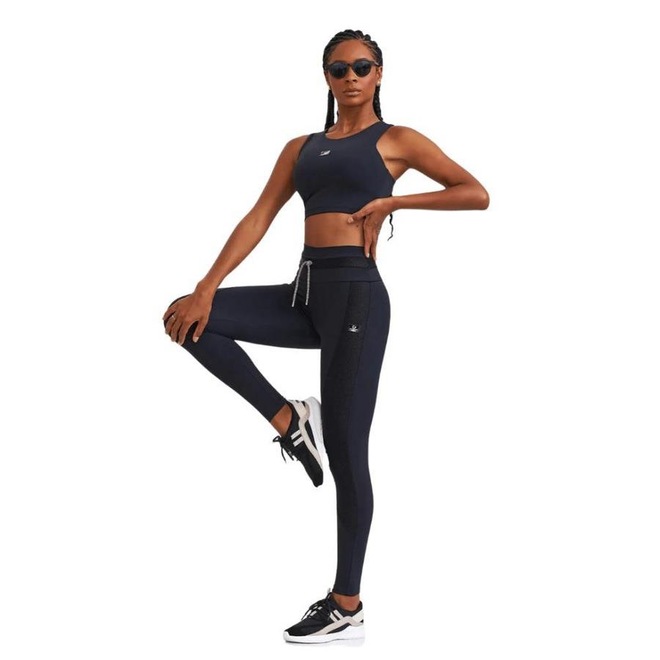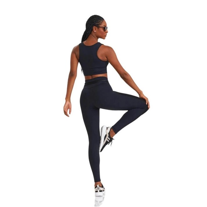 Legging com detalhes nas pernas em tecido texturizado e com brilho sofisticado, e na cintura, cadarço ajustável.