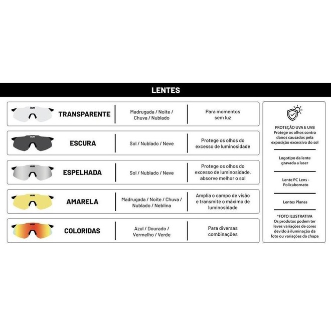 As lentes para os óculos HUPI são projetadas para proporcionar um desempenho aprimorado durante atividades como pedalar ou correr. Além de oferecerem proteçãoUVA e UVB 400,possuem algumas características específicas. Aqui estão os detalhes: