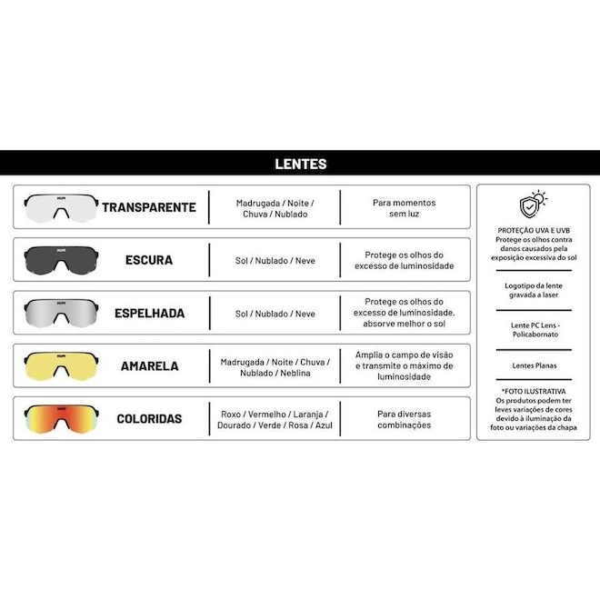 A seguir, temos um exemplo das cores de lentes disponíveis e as condições climáticas para ajudá-lo a fazer a compra. Escolhasua lente: