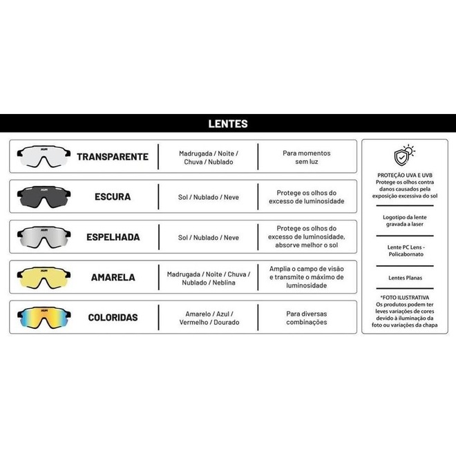 As lentes para os óculos HUPI são projetadas para proporcionar um desempenho aprimorado durante atividades como pedalar ou correr. Além de oferecerem proteção contra os raiosUVA e UVB 400 e UV400 com garantia vitalícia, possuem algumas características específicas. Aqui estão os detalhes: