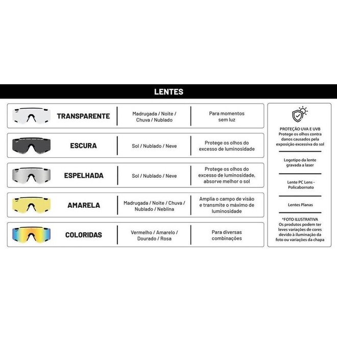 Material da lente: As lentes são feitas de policarbonato, um material leve e resistente, que oferece durabilidade e resistência a impactos.