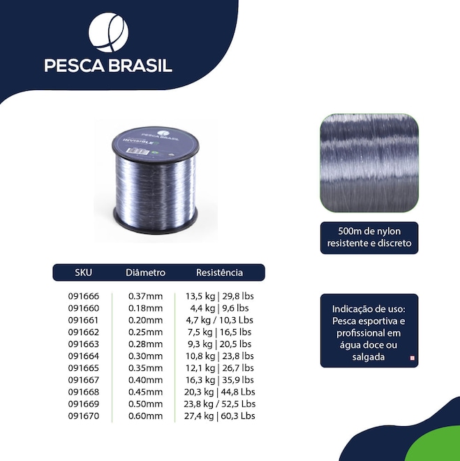 - Monofilamento de nylon premium: Garante resistência à abrasão e excelente elasticidade.