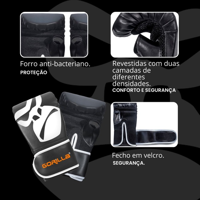 Ideal para treinos em sacos de pancadas, manoplas e aparadores. Características Produzida em PU flexível e resistente; Revestido com duas camadas de diferentes densidades; Sua costura foi aprimorada com uma linha especial para a categoria dando maior segurança em seu treino e prolongando a vida útil do produto.