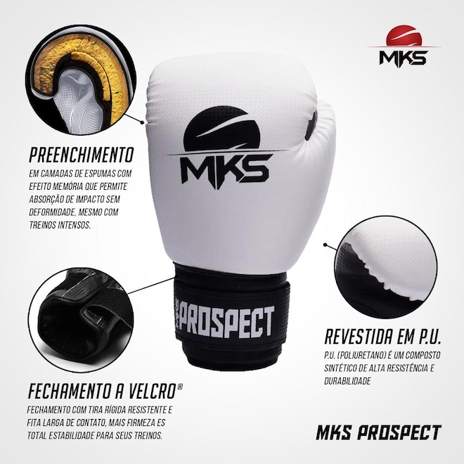 A Luva de Boxe MKS New Prospect foi a primeira a entrar no mercado, há 20 anos, e desde então tem a mesma receita de produção. O enchimento é de camadas de espuma adicionadas manualmente, com total preocupação com o molde e proporção. Essa luva de boxe é revestida em P.U (Poliuretano), um composto sintético de alta resistência e flexibilidade.