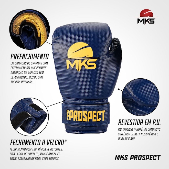 A Luva de Boxe MKS New Prospect foi a primeira a entrar no mercado, há 20 anos, e desde então tem a mesma receita de produção. O enchimento é de camadas de espuma adicionadas manualmente, com total preocupação com o molde e proporção. Essa luva de boxe é revestida em P.U (Poliuretano), um composto sintético de alta resistência e flexibilidade.