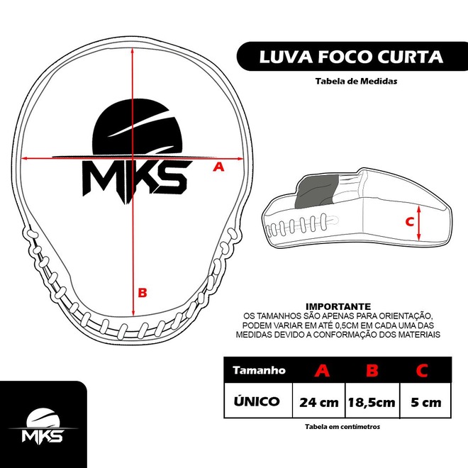 Luva de foco produzida em PU premium (sigla para Poliuretano, um polímero resistente a rasgos e com grande elasticidade e resistência), a luva de foco MKS Combat é indicada para treinos de MMA, Kickboxing, Boxe ou Muay Thai com parceiro e tem resistência ideal para absorver até os golpes mais potentes, indicada para melhorar a velocidade e precisão de ataques com os pés e as mãos, qualidade superior e durabilidade, vendida em par.