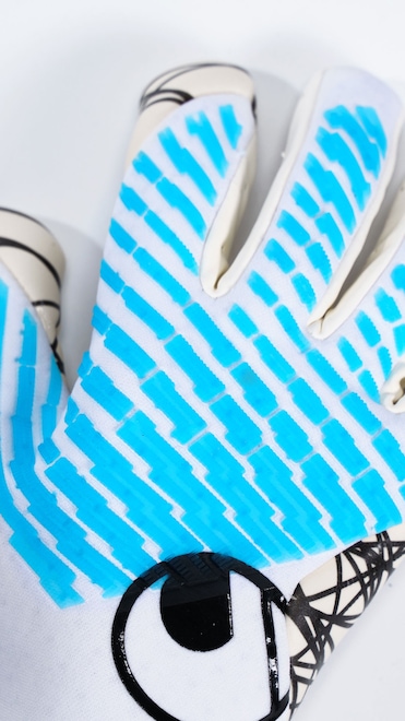 A espuma envolve as laterais da mão, aumentando a área de contato com a bola. Ela se estende para o interior do dedo indicador e do dedo mínimo, oferecendo aderência máxima durante as defesas. Isso proporciona ainda mais controle — não importa de que forma a bola venha.