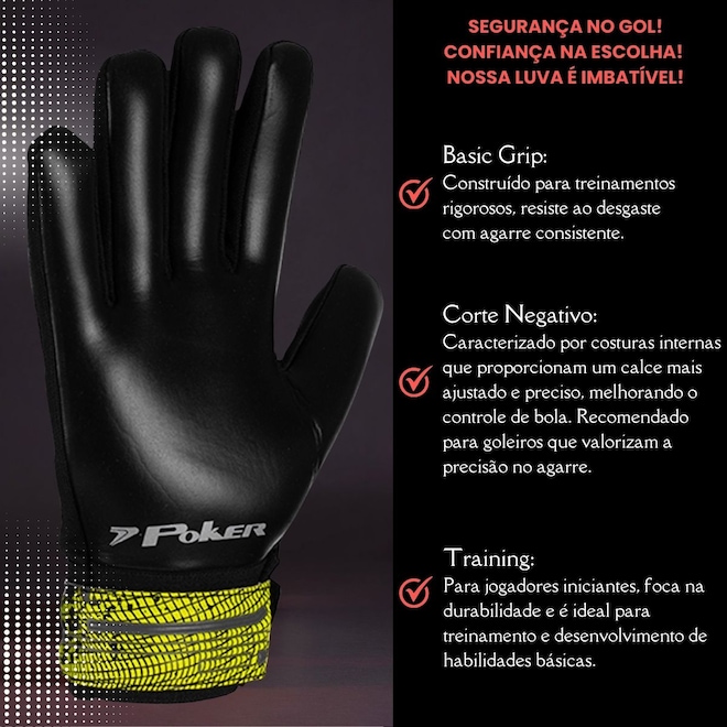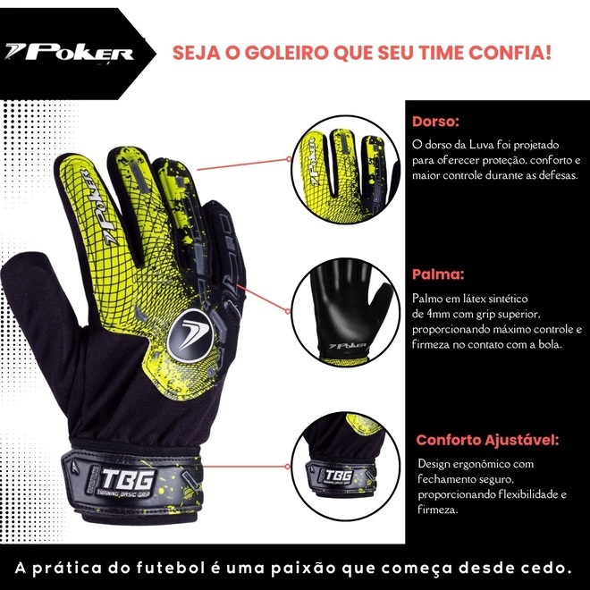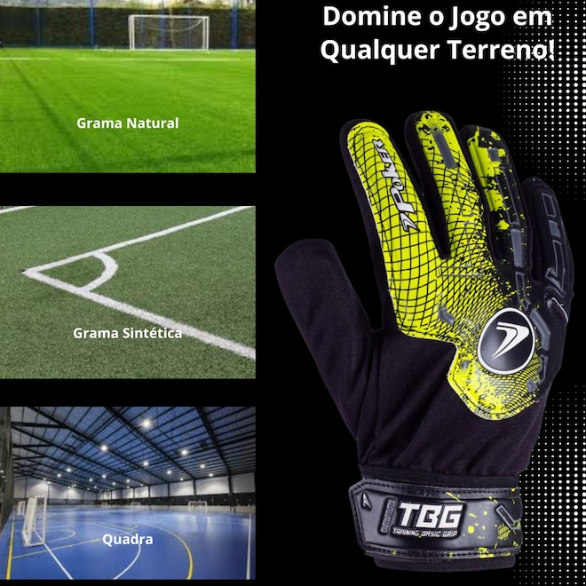 Aderência Superior: Palmo em látex sintético de 4mm com tecnologia Dorso Super Grip para controle máximo da bola.