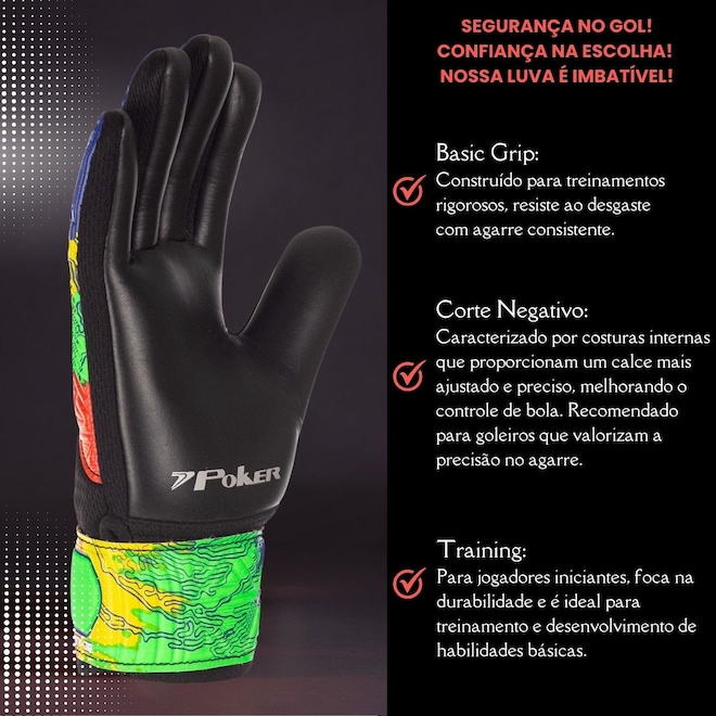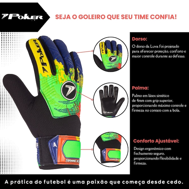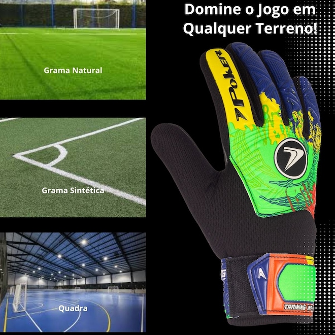 Proteção e Durabilidade: Material resistente que protege as mãos e assegura longa vida útil.Aderência Superior: Palmo em látex sintético de 2.5mm de látex sintético + 3mm de espuma com tecnologia avançada para controle máximo da bola.