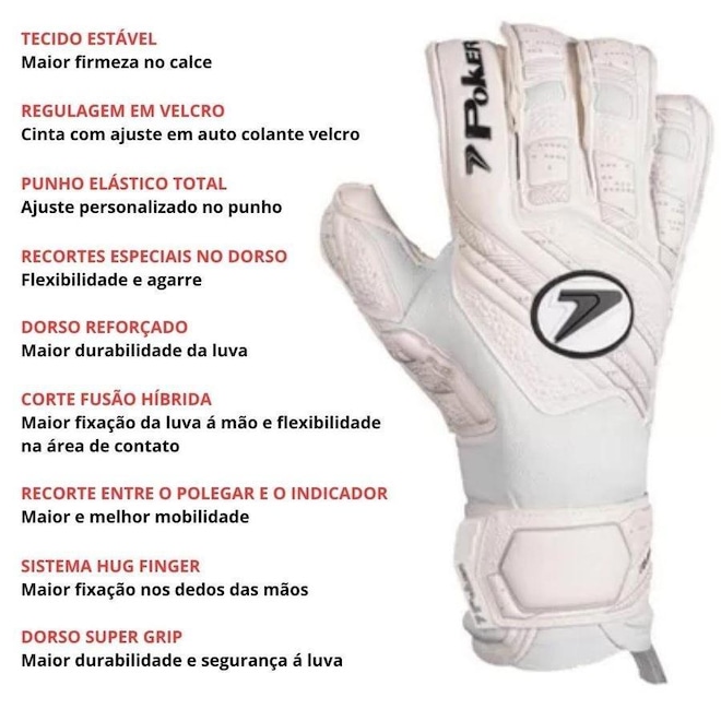 O Corte Fusão Híbrida garante maior fixação da luva à mão e flexibilidade na área de contato. Agarre mais eficiente com bolas de diversos tamanhos. O Dorso Super Grip é desenvolvido com material resistente para dar maior durabilidade e segurança à luva.