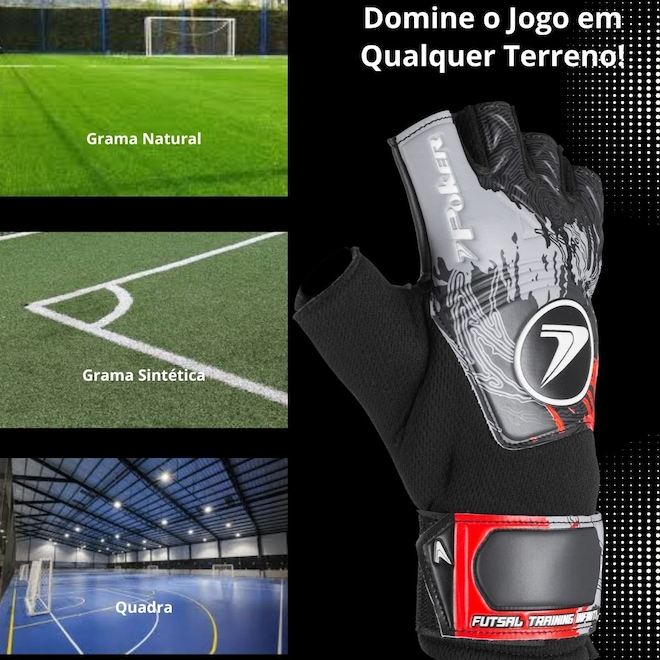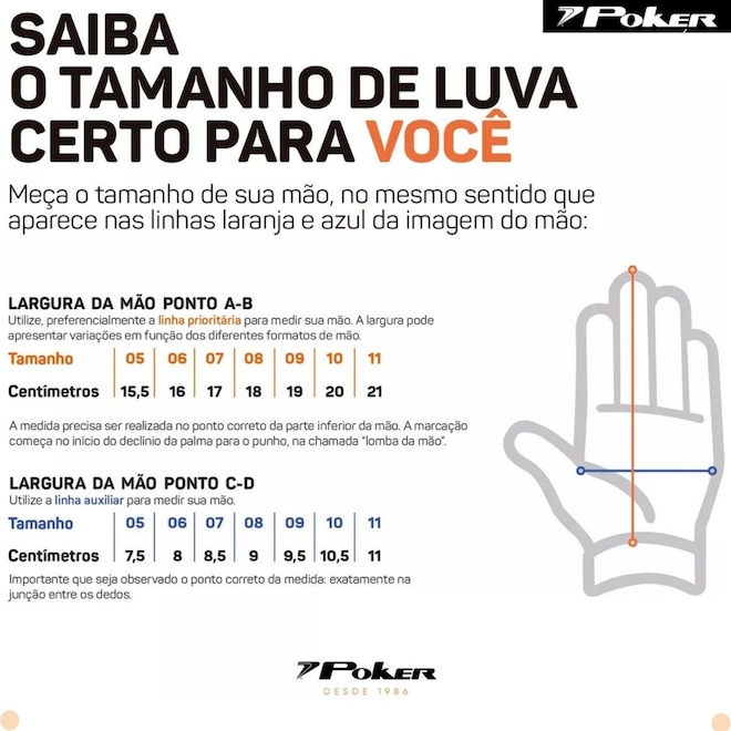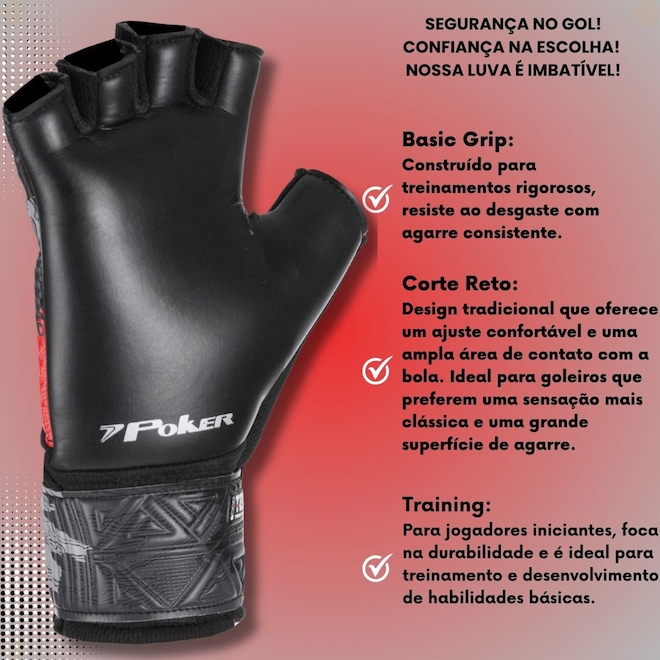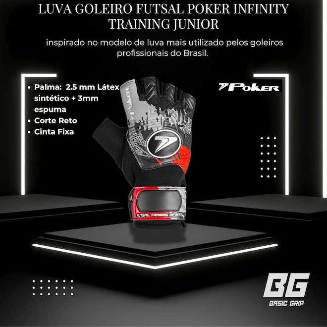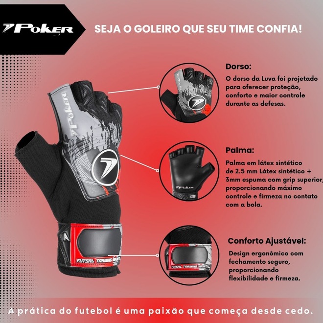 Desenvolvida para crianças de 7 a 12 anos, a Luva Poker Infinity Training é ideal para futsal, campo e society. O modelo sem dedos (fingerless) garante mais mobilidade e controle, enquanto a palma em látex de 2,5mm com espuma de 3mm proporciona aderência e absorção de impacto nas defesas. Com dorso ventilado, corte reto anatômico e fechamento, oferece ajuste preciso e conforto térmico para treinos e jogos intensos. Destaques: Modelo infantil fingerless (sem dedos) Palma em látex 2,5 mm + espuma 3 mm: grip e conforto Corte anatômico com ajuste firme Ideal para futsal, campo e society. Tamanhos 5 ao 7 (verifique a tabela nas fotos) Importante: desgaste na palma é normal e não caracteriza defeito. Evite raspar no chão para prolongar a vida útil. Produto original Poker – referência nacional em luvas de goleiro.