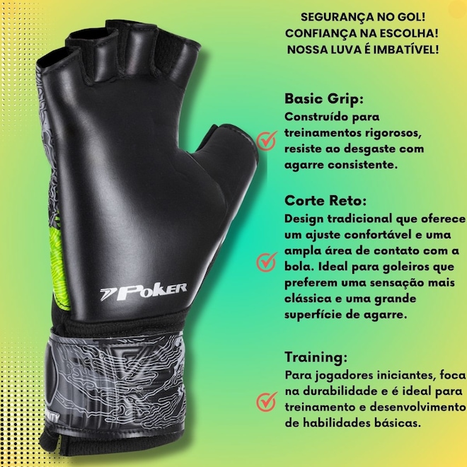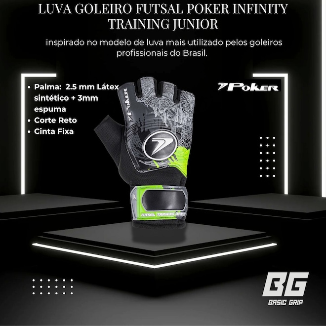Desenvolvida para crianças de 7 a 12 anos, a Luva Poker Infinity Training é ideal para futsal, campo e society. O modelo sem dedos (fingerless) garante mais mobilidade e controle, enquanto a palma em látex de 2,5mm com espuma de 3mm proporciona aderência e absorção de impacto nas defesas. Com dorso ventilado, corte reto anatômico e fechamento, oferece ajuste preciso e conforto térmico para treinos e jogos intensos. Destaques: Modelo infantil fingerless (sem dedos) Palma em látex 2,5 mm + espuma 3 mm: grip e conforto Corte anatômico com ajuste firme Ideal para futsal, campo e society. Tamanhos 5 ao 7 (verifique a tabela nas fotos) Importante: desgaste na palma é normal e não caracteriza defeito. Evite raspar no chão para prolongar a vida útil. Produto original Poker – referência nacional em luvas de goleiro.