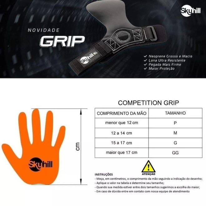 Por que usar este produto: O Hand Grip Competition Skyhill foi desenvolvido para proporcionar uma pegada muito mais firme na barra, permitindo que você execute movimentos como pull up, chest to bar, toes to bar, ou bar muscle up com mais segurança e eficiência.
