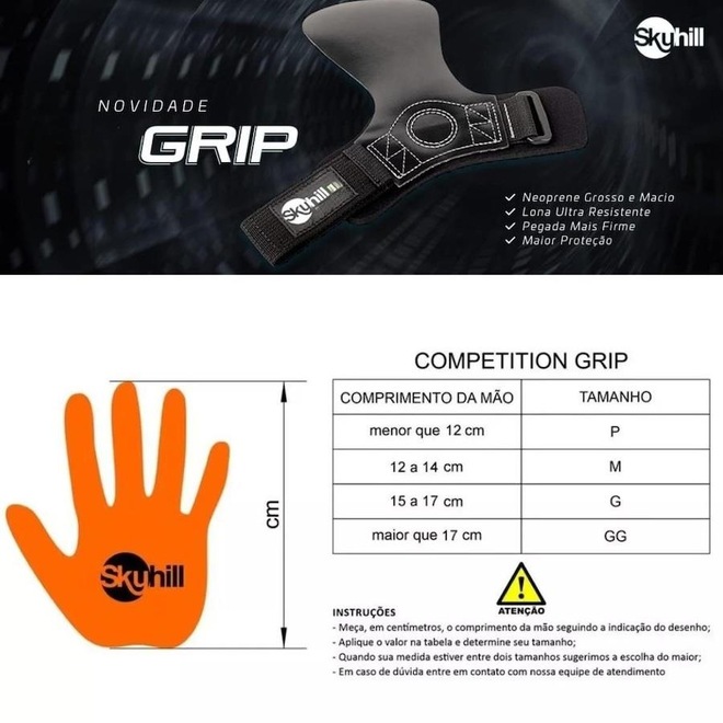 O novo Hand Grip COMPETITION da Skyhill é o acessório perfeito para quem busca melhorar seu desempenho nos treinos. Com um material ultra resistente de uma só camada, mais grosso e sem costuras na ponta, além de um punho de neoprene extra macio, essa luva proporciona todo o conforto e proteção que você precisa. Destaque do Produto: Novo shape com camada única, sem costuras e saliência de espuma na extremidade, proporcionando maior conforto durante os exercícios. Neoprene mais grosso na parte que fica em contato com o punho, oferecendo ainda mais estabilidade e segurança. Fivela de aço carbono soldado ultra resistente, aprovada em testes de tração, garantindo maior durabilidade. Aplicação exclusiva na parte interna do grip para você escrever seu nome e deixá-lo identificado. Tecnologia de produção em máquinas eletrônicas, garantindo um acabamento superior em relação aos produtos concorrentes. Por que usar este produto: O Hand Grip Competition Skyhill foi desenvolvido para proporcionar uma pegada muito mais firme na barra, permitindo que você execute movimentos como pull up, chest to bar, toes to bar, ou bar muscle up com mais segurança e eficiência. Além disso, ele oferece proteção à palma da mão, evitando a formação de calos e bolhas durante o treino. Seja na musculação, treinos funcionais ou WODs, essa luva irá te ajudar a ir além dos seus limites. Quem usa Skyhill: O Hand Grip Competition Skyhill é utilizado pelos melhores atletas e celebridades do mundo Fitness. Com a assinatura de Rafael Kilipper, ginasta renomado com ampla experiência no CrossFit, esse grip é a escolha de excelência para ginastas e praticantes de CrossFit em todo o Brasil. Não perca a oportunidade de treinar como os melhores! Test agora o Hand Grip Competition Skyhill e eleve seu treino a um novo patamar de excelência! Marca: Skyhill Composição/Material: Trama de nylon de alta resistência com acabamento externo em PVC. Munhequeira com ajuste em velcro e acabamento interno em Neoprene 5mm. Tamanhos Disponíveis: P, M, G, GG Com tiras ajustáveis: Sim Cor principal: Cor secundária: Dimensões: 15 × 15 × 2 Peso: 118 gref: M114NS