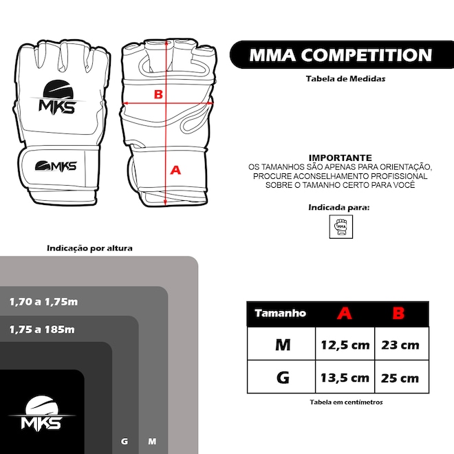 Para treinos e lutas, as Luvas Mks Combat para MMA são perfeitas, o ajuste anatômico fino e sem dedos coloca a mão em uma posição natural, são resistentes, confortáveis, proporcionam excelente proteção.
