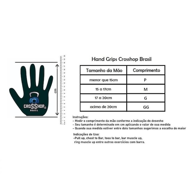 Hand Grip Carbon Crosshop Brasil   Proteja as suas mãos com o Hand Grip Carbon Crosshop Brasil, a fibra de Carbono vai te dar todo o suporte necessário e uma durabilidade elevada, sendo perfeita para todos os movimentos que você deseja ter mais segurança e aderência em todos os esportes de alto rendimento.   A Carbon Hand Grip Crosshop Brasil tem uma pegada super aderente, que "gruda" na barra. Como a grip não tem os encaixes para os dedos, é ótima e versátil para todos movimentos de ginástica e levantamento de peso.  Possui design anatômico para mais conforto durante os treinos, material super aderente para maior segurança em exercícios, principalmente nos de grande amplitude, punho em neoprene 5mm e passante em metal.   Proporciona uma pegada muito mais firme na barra, melhorando sua performance e economizando energia para que você consiga fazer mais repetições dos exercícios de seu treino (pull-up e demais movimentos). Produto liberado em competições.   Nosso Hand Grip é feito de lona adicionada a fibra de carbono ultra resistênte de dupla face com alta proteção para eliminar o deslizamento, leve e totalmente lisa para dar liberdade a sua mão durante os movimentos. O modelo Hand Grip Carbon possui uma munhequeira acoplada a grip, ajustável através de fecho de contato, munhequeira feita com acabamento em neoprene extra macio, com sobras abaixo da fivela de ajuste, evitando o contato direto com a pele. Os Hands Grips da Crosshop Brasil são o ponto chave para melhorar seu desempenho proporcionando excelência na sua performance.   Tamanhos ( Medir a Palma da Mão) P ? menor que 15cm; M- 15 a 17cm; G- 17 a 20cm; GG ? acima de 20cm.                Diferenciais: - Lona Emborrachada de Alta Aderência. - Longa Durabilidade. - Corpo de Munhequeira em Neoprene 6mm. - Passador em Metal Reforçado. - Fecho de Contato Premium.   Crosshop Brasil desde 2019 visando qualidade , segurança e performance de seus atletas e clientes.