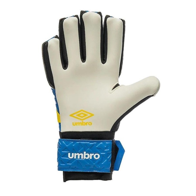 Luva de goleiro com recorte negativo. A palma da mão é confeccionada em látex de 3 mm com logo Umbro. O dorso é em PVC texturizado com grafismos personalizados, logo Umbro Letter no dedo indicador e assinatura Adamant no dedo anelar. O dedão vem parcialmente coberto por látex com Diamante Umbro. O punho com elástico traz fechamento em velcro, faixa sobreposta ao elástico em PVC texturizado com grafismos personalizados e ponteira em borracha.