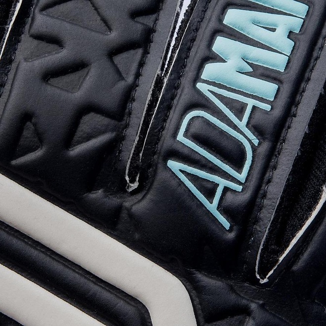 Luva de goleiro com recorte negativo. A palma da mão é confeccionada em látex de 3 mm com logo Umbro. O dorso é em PVC texturizado com grafismos personalizados, logo Umbro Letter no dedo indicador e assinatura Adamant no dedo anelar. O dedão vem parcialmente coberto por látex com Diamante Umbro. O punho com elástico traz fechamento em velcro, faixa sobreposta ao elástico em PVC texturizado com grafismos personalizados e ponteira em borracha.ref: M124IV
