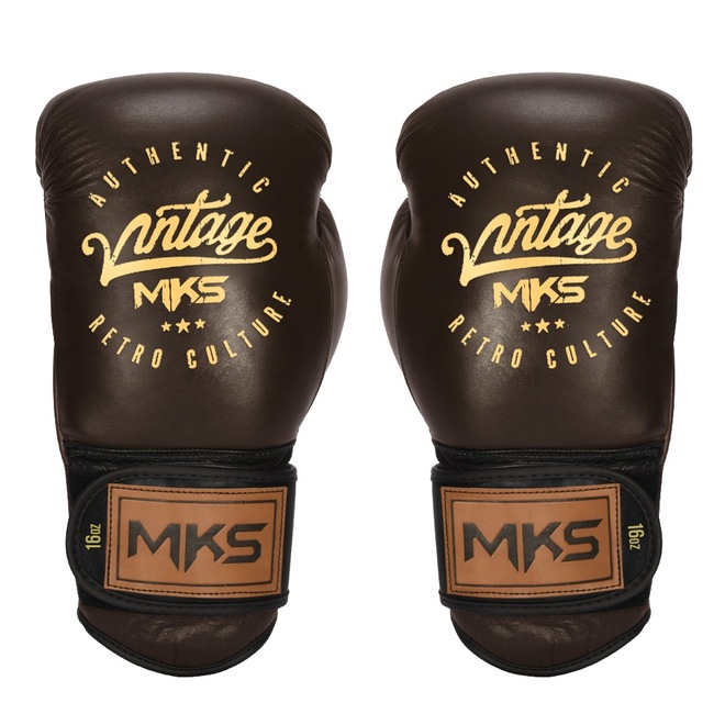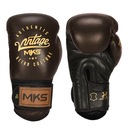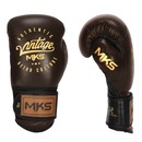 Luvas MKS Thai Boxe Vintage em Couro, revestida com couro bovino genuíno marrom e bege "VINTAGE" de grau duplo A. Forro em tecido de espuma adesiva de poliéster. Trava de polegar para segurança e proteção. Barra acolchoada para maior aderência.