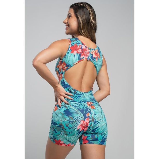 Macaquinho curto com detalhes na costas, confeccionado em suplex maleável e confortável.