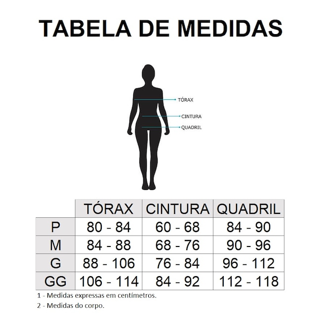 - Tamanho GG: Tórax (106 - 114 cm), cintura (84 - 92 cm), quadril (112 - 118 cm)