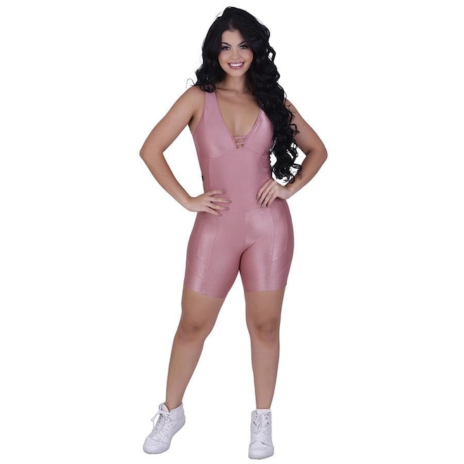MACACÃO CURTO, MEIA COXA, FRENTE DECOTE V, COSTA CAVADA COM DETALHE TIRAS CRUZADAS, BOJO REMOVÍVEL, PODE SER USADO COM OU SEM ELE, RECORTE MODELADOR, DELINEIA AS CURVAS DO CORPO.