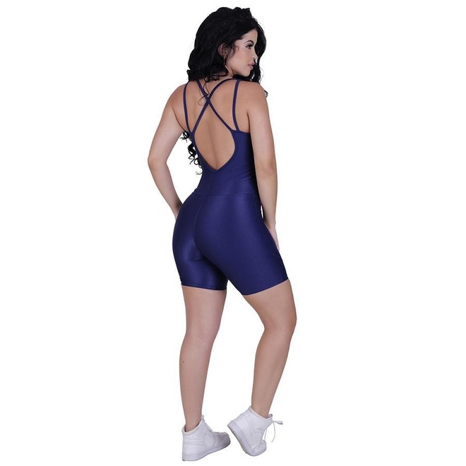 MACACÃO CURTO, MEIA COXA, FRENTE DECOTE V, COSTA CAVADA COM DETALHE TIRAS CRUZADAS, BOJO REMOVÍVEL, PODE SER USADO COM OU SEM ELE, RECORTE MODELADOR, DELINEIA AS CURVAS DO CORPO.