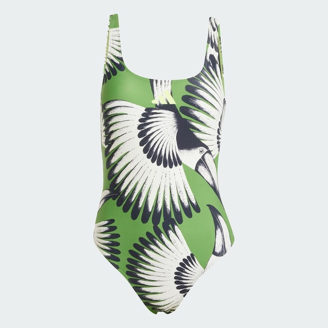 Seja descansando em uma praia exótica ou escapando do calor da cidade na piscina local, este maiô adidas permite que você dê um show. Desenvolvido em parceria com a FARM Rio, ele exibe uma estampa colorida de tucano. O tecido elástico resistente ao cloro permite que você se movimente facilmente pela água. Este produto é feito com pelo menos 70% de materiais reciclados. Ao escolher o reciclado, podemos reutilizar materiais já criados, o que ajuda a reduzir o desperdício e a nossa dependência de recursos finitos, além de reduzir a pegada dos produtos que fabricamos.