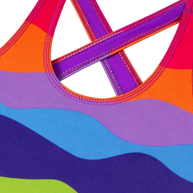 As alças cruzadas nas costas garantem segurança e ajuste perfeito.
