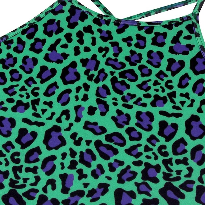 Esse modelo possui estampa em sublimação animal print, parte da frente fechada e decote com alças cruzadas nas costas estilo new cross.