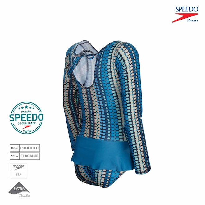 O Maillot Kusama Kids é produzido em Lycra XtraLife, malha que garante maior resistência em contato com o cloro. Possui mangas longas e saia para assegurar muito estilo durante as atividades aquáticas.