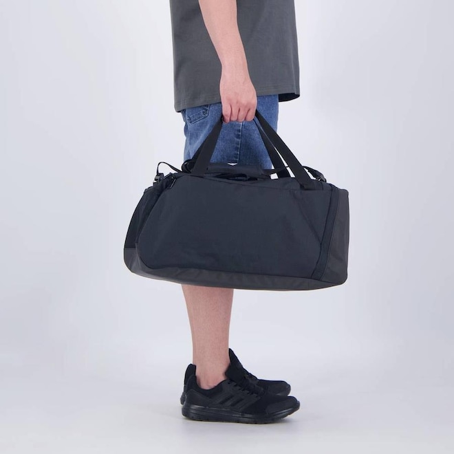 Bolso: Um interno e suspenso, com zíper, um lateral com zíper e 01 frontal com zíper