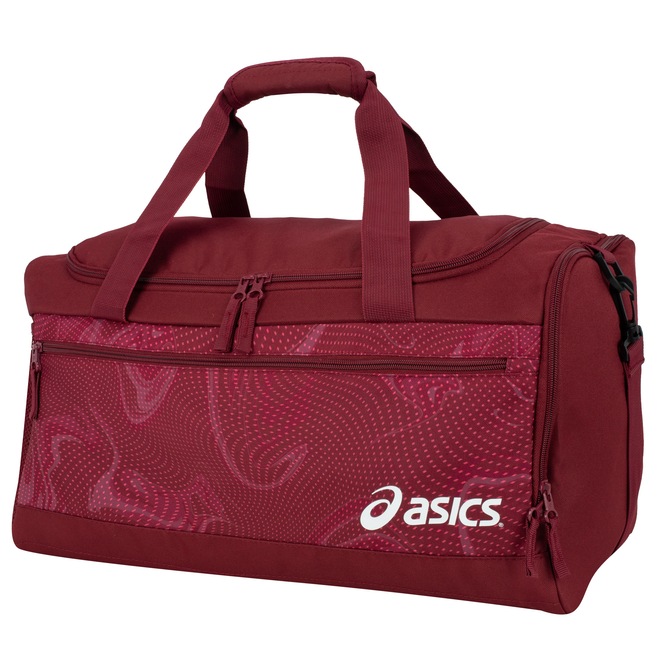 A mala ASICS contém compartimento principal amplo, com bolso interno e divisória com velcro, além de externo com porta-calçados, bolso e divisória em velcro e bolso lateral com zíper.