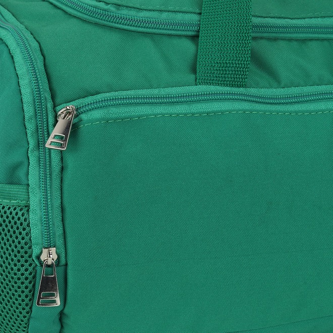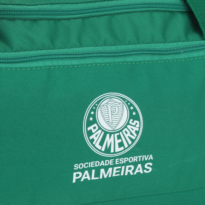 A mala do Palmeiras é em fechamento por zíper, com alças manuais, tiracolo regulável e ajuste em velcro para junção.