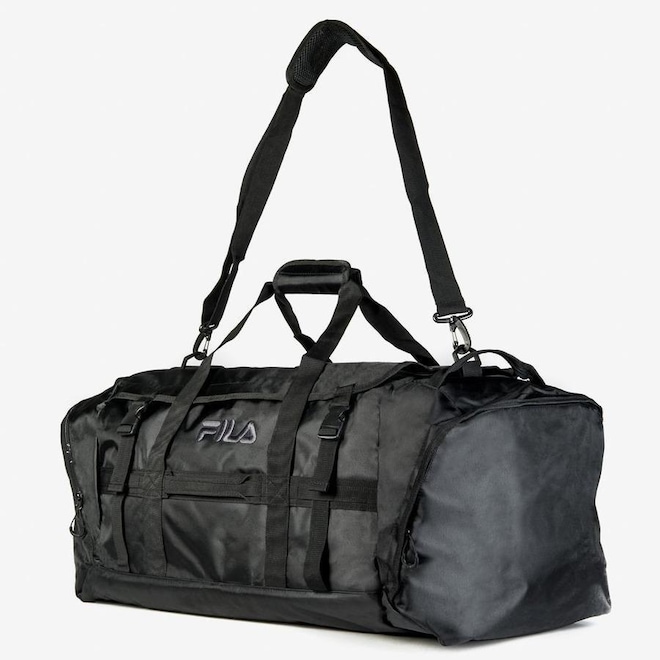 Mala de viagem confeccionada em tecido a prova d?água na parte inferior. O compartimento principal possui repartição, fechamento em zíper, proteção com correia e fivela com fechamento de engate para prender ao painel da frente. Possui bolsos laterais com fechamento em zíper, alças de mão em ambos os bolsos e nas laterais dos painéis frontais e traseiros, correia na parte frontal e traseira e alças de mão com fechamento em velcro. Logo Fila bordado no painel da frente e forro personalizado Fila.