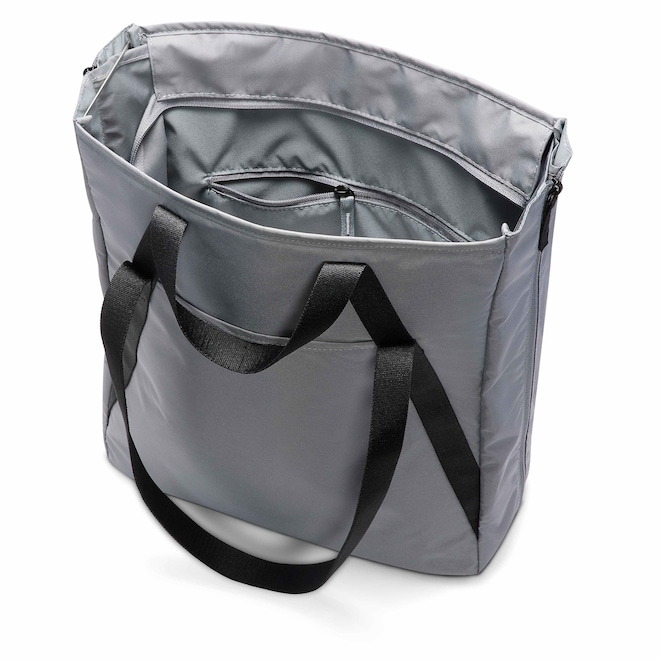 Não importa a intensidade dos seus treinos: esta bolsa tote foi feita para dar conta do recado. Você pode contar com vários bolsos fundos no interior da sacola em opções abertas e com zíper para mais segurança. As partes frontal e traseira apresentam bolsos para guardar pequenos objetos que precisam de acesso fácil. Não se engane com o tamanho. As laterais contam com painéis de tecido que se expandem para oferecer espaço extra sempre que você precisar.
