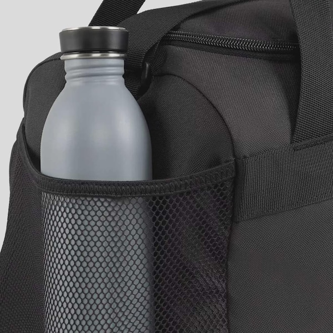 Dimensões aproximadas (A x L x P): 22 x 44 x 16 cm Compartimento: Um principal amplo Abertura/fechamento: Zíper bidirecional Alças: Duas de mão e uma ajustável para ombro Bolsos: Um frontal e um lateral, ambos com zíper Composição: 100% Poliéster Cor predominante: Preta Peso aproximado: 350g Origem: Importada Gênero: Unissex Logo: Estampada Porta-garrafas: Sim Tamanho único