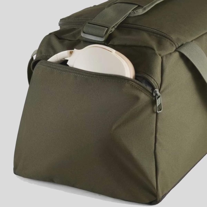 Dimensões aproximadas (A x L x P): 26 x 63 x 28 cm Alças: Duas de mão e uma de ombro ajustável Abertura/fechamento: Zíper bidirecional Compartimento: Um principal amplo Bolsos: Um frontal e um lateral, ambos com zíper Composição: 100% Poliéster Capacidade/ Volume: 48 L Cor predominante: Verde oliva Peso aproximado: 490 g Porta-garrafas: Sim Logo: Estampada Origem: Importada Gênero: Unissex Tamanho único