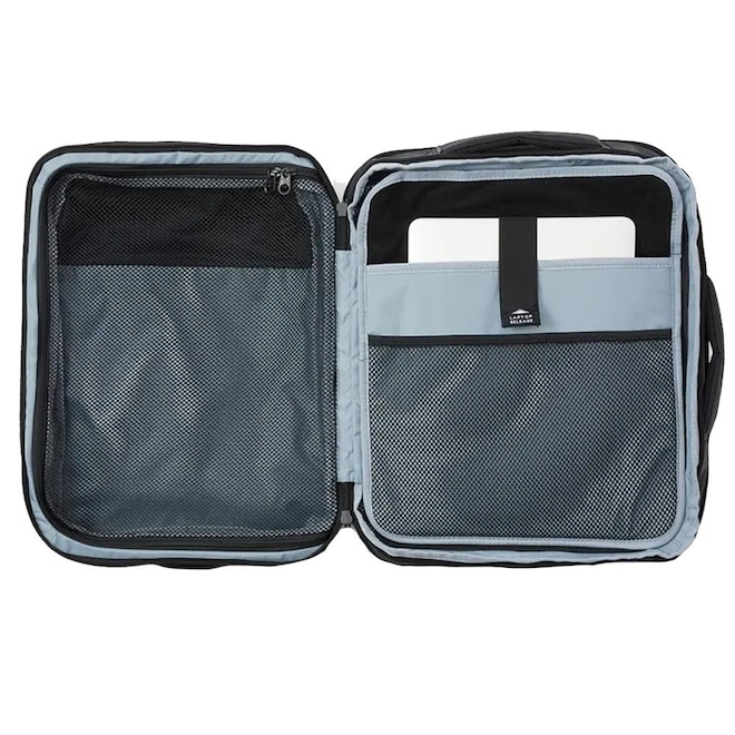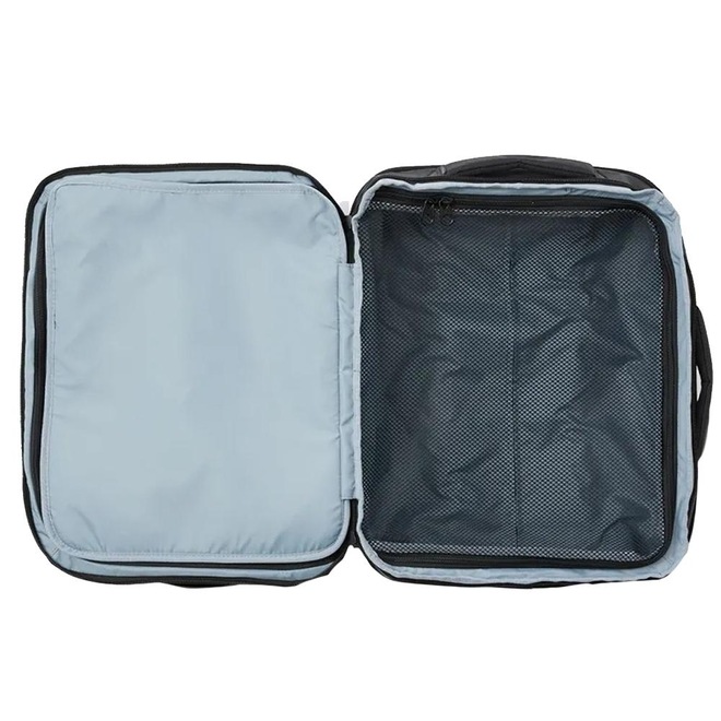 Mala Rip Curl com seção para laptop, base de EVA moldada por compressão, self-standing, alça telescópica, rodas em linha, zíperes bloqueáveis e tamanho compatível como bagagem de mão, para voos domésticos.